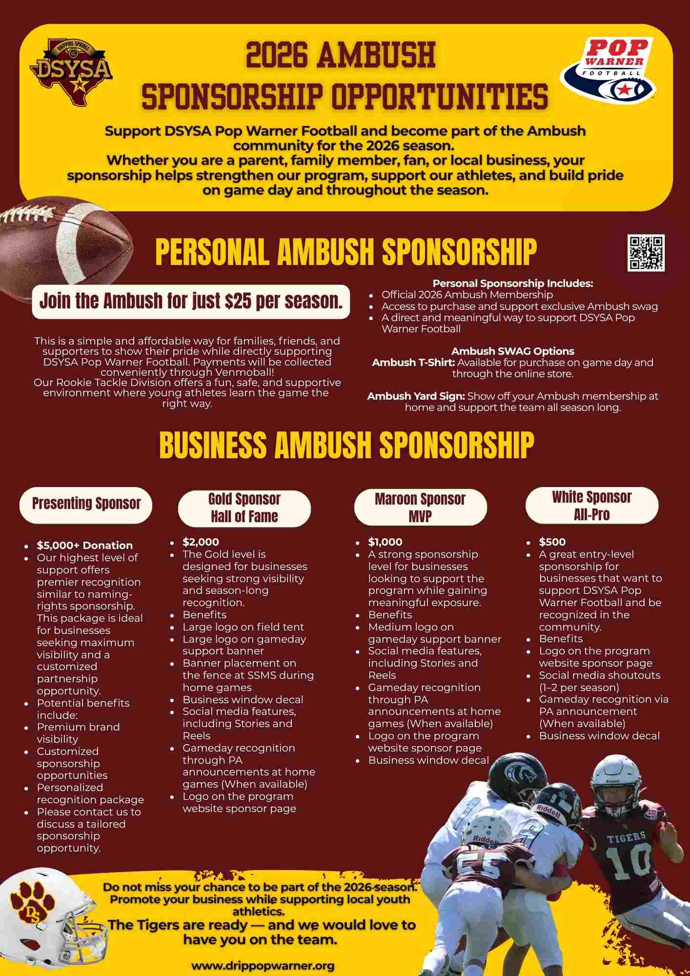 A great entry-level sponsorship for businesses that want to support DSYSA Pop Warner Football and be recognized in the community.